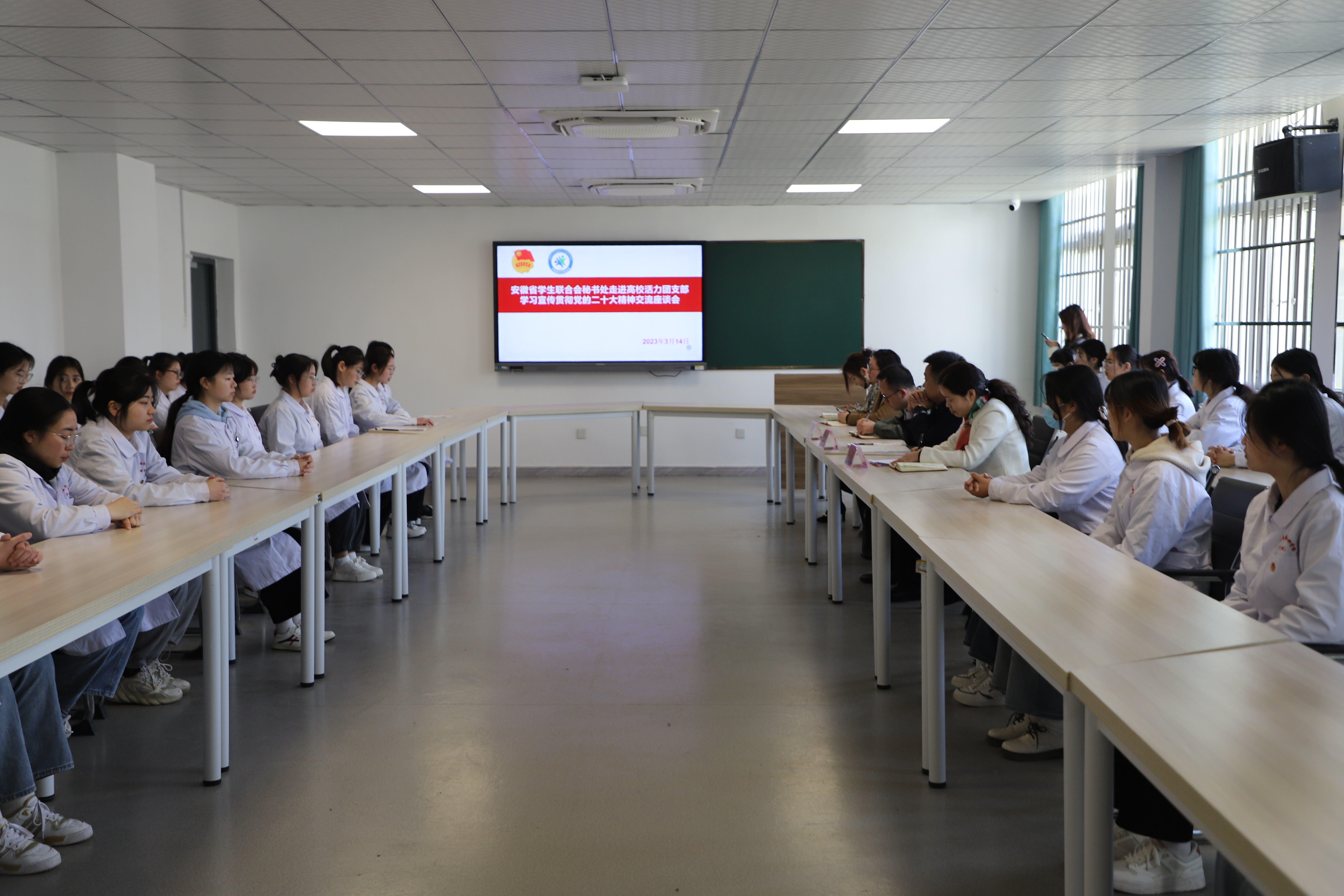3月14日上午,团省委学校部副部长张国栋走进安徽省活力团支部——今年会护理学院2021级护理14班团支部,向团员青年宣讲党的二十大精神,会议由团市委书记项薇主持,团市委副书记鲍瑜斌、校团委全体人员及班级辅导员参加。