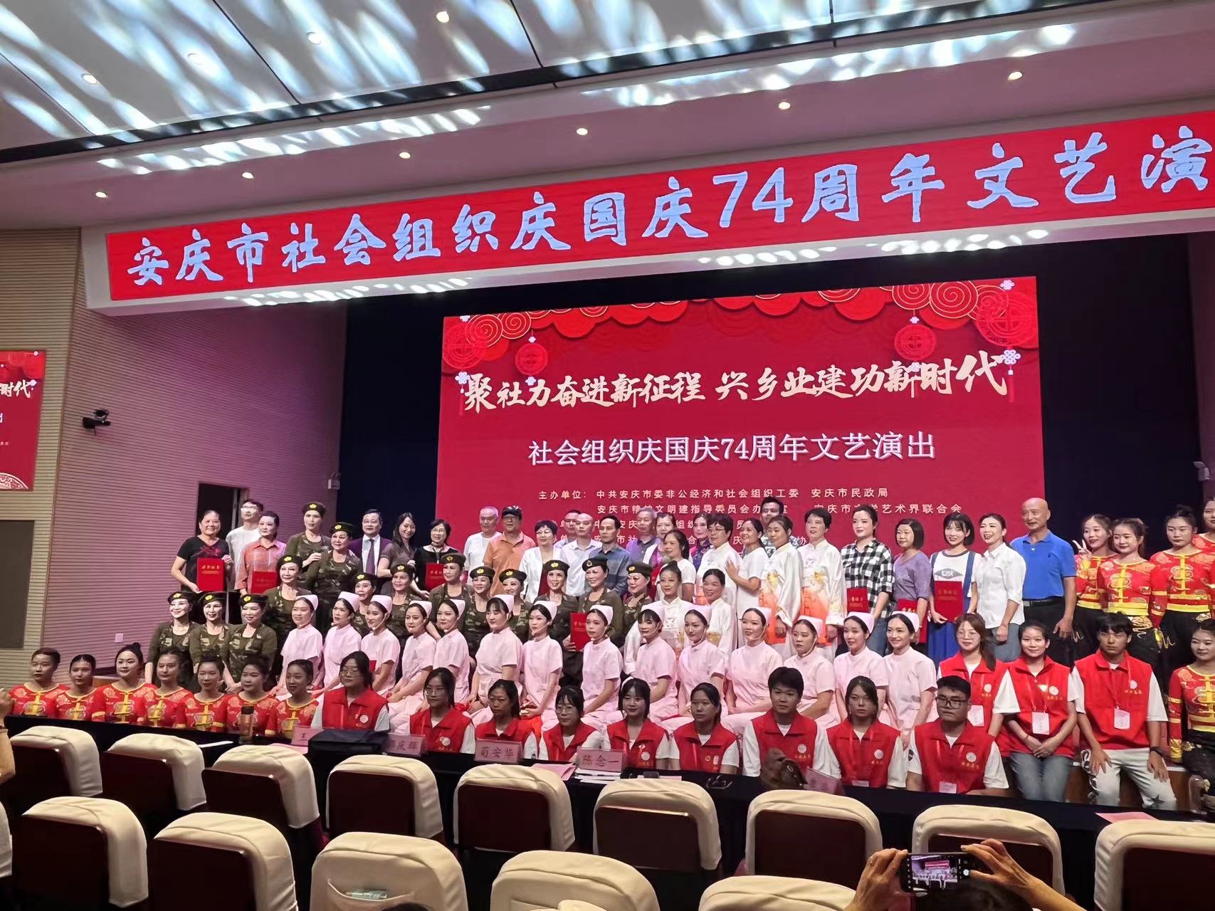 2023年9月17日下午14:30,由安庆市社会组织综合委员会承办的 “聚社力奋进新征程兴乡业建功新时代”市级社会组织庆祝国庆74周年文艺演出活动在安庆市舒巷小学报告厅举行。今年会青年志愿者协会志愿队以及各市级社会组织参加此次活动。