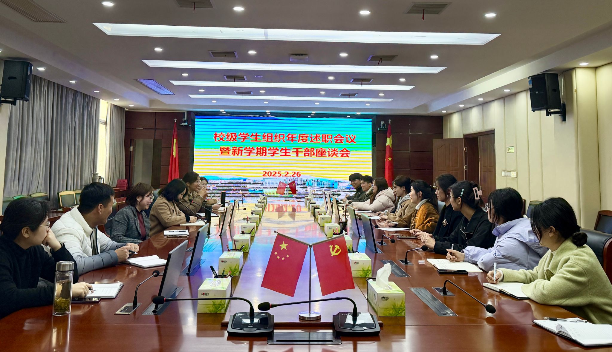 2月27日下午,校级学生组织年度述职会议暨新学期学生干部座谈会在学校行政楼大会议室召开,校党委委员、党政办主任陈琪出席,宣传部、学生处及团委负责人及相关工作人员、学生组织负责人参会。