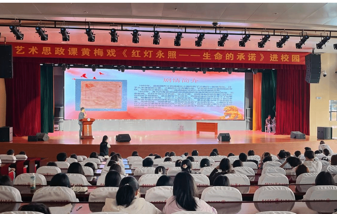 2025年3月26日下午,学校双创中心百花亭学术报告厅内,500余名师生共上一堂特殊的艺术思政课。由安徽黄梅戏艺术职业学院师生带来的国家艺术基金舞台艺术资助项目——黄梅戏《红灯永照——生命的承诺》来校演出,校党委委员、党政办主任陈琪,校、院两级团组织负责人与学生代表共同观看。婉转悠扬的黄梅戏唱腔,结合跌宕起伏的红色故事,让师生们近距离感受到传统戏曲独特的艺术魅力,以及红色文化穿越时空的蓬勃生命。