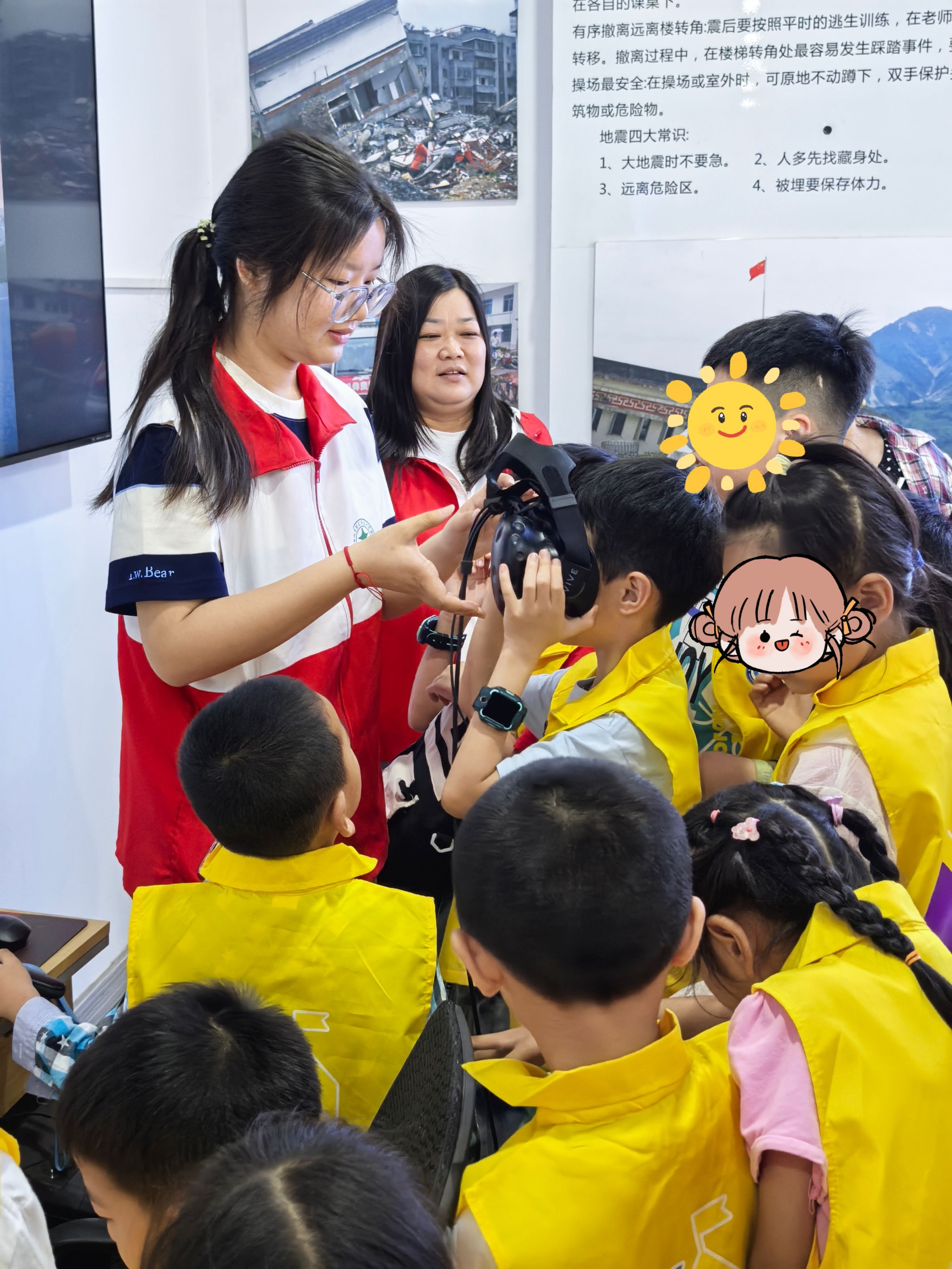在应急救护体验区,小学员们通过趣味体验项目学习实用急救技能。学习如何正确地处理和包扎各种伤口、心肺复苏等急救操作以及不同场景下如何避险和自救。如用VR技术身临其境认识自然灾害的危害;通过地震平台逼真的晃动认识到如何科学避震。