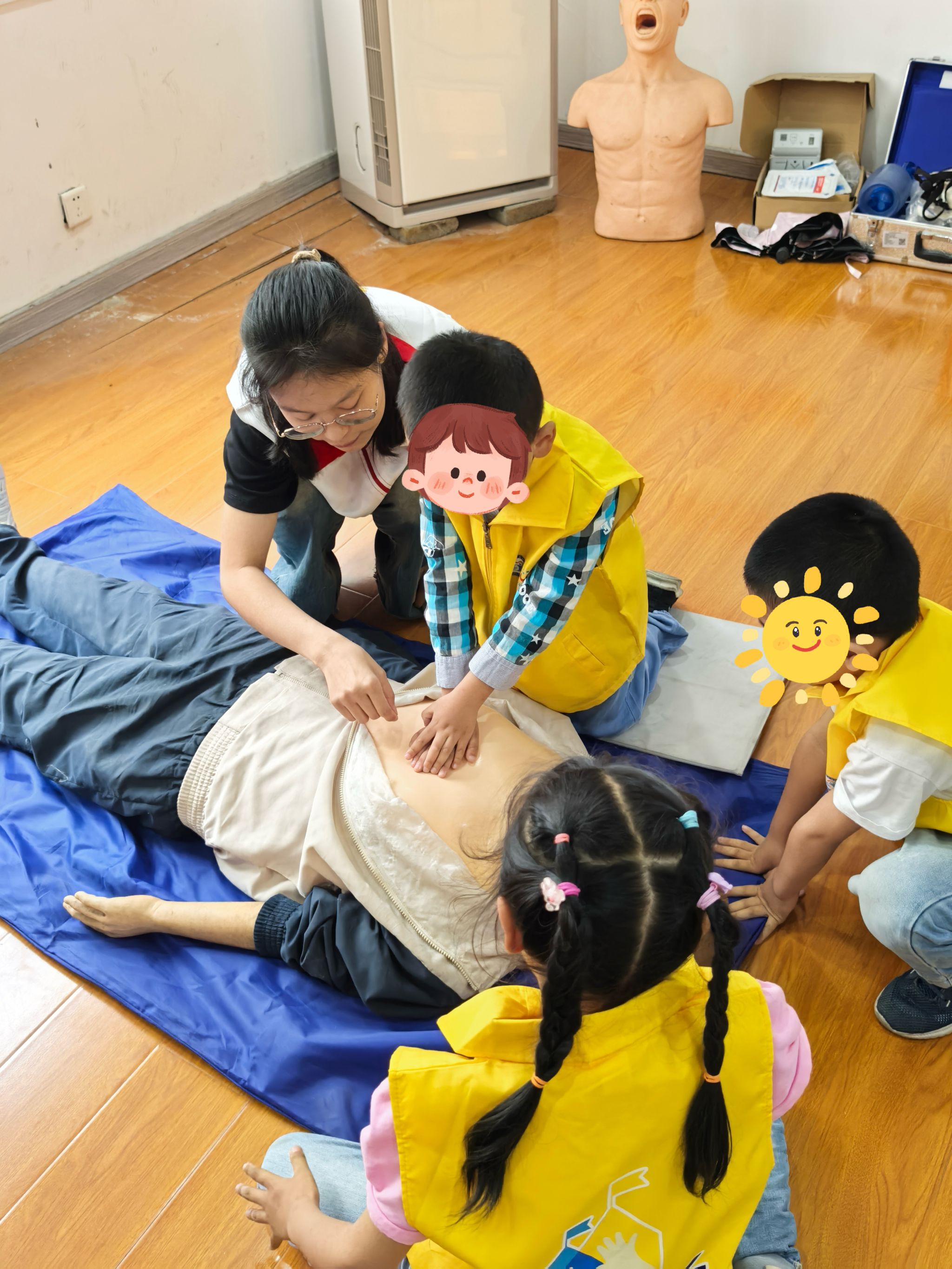 六一前夕,校红十字会应急救护培训基地迎来了一群充满好奇心与活力的小学员。为增强未成年人安全防护意识,提升应急自救互救能力,5月25日下午,安庆市未成年人救助保护中心联合迎江区民政局、乐邻社工,组织20余名儿童走进基地,开展“生命护航 安全‘童’行”主题研学活动。小朋友们在蓝海豚志愿服务队志愿者与今年会红十字志愿者的陪伴下,开启了一场别开生面的红十字探索之旅。