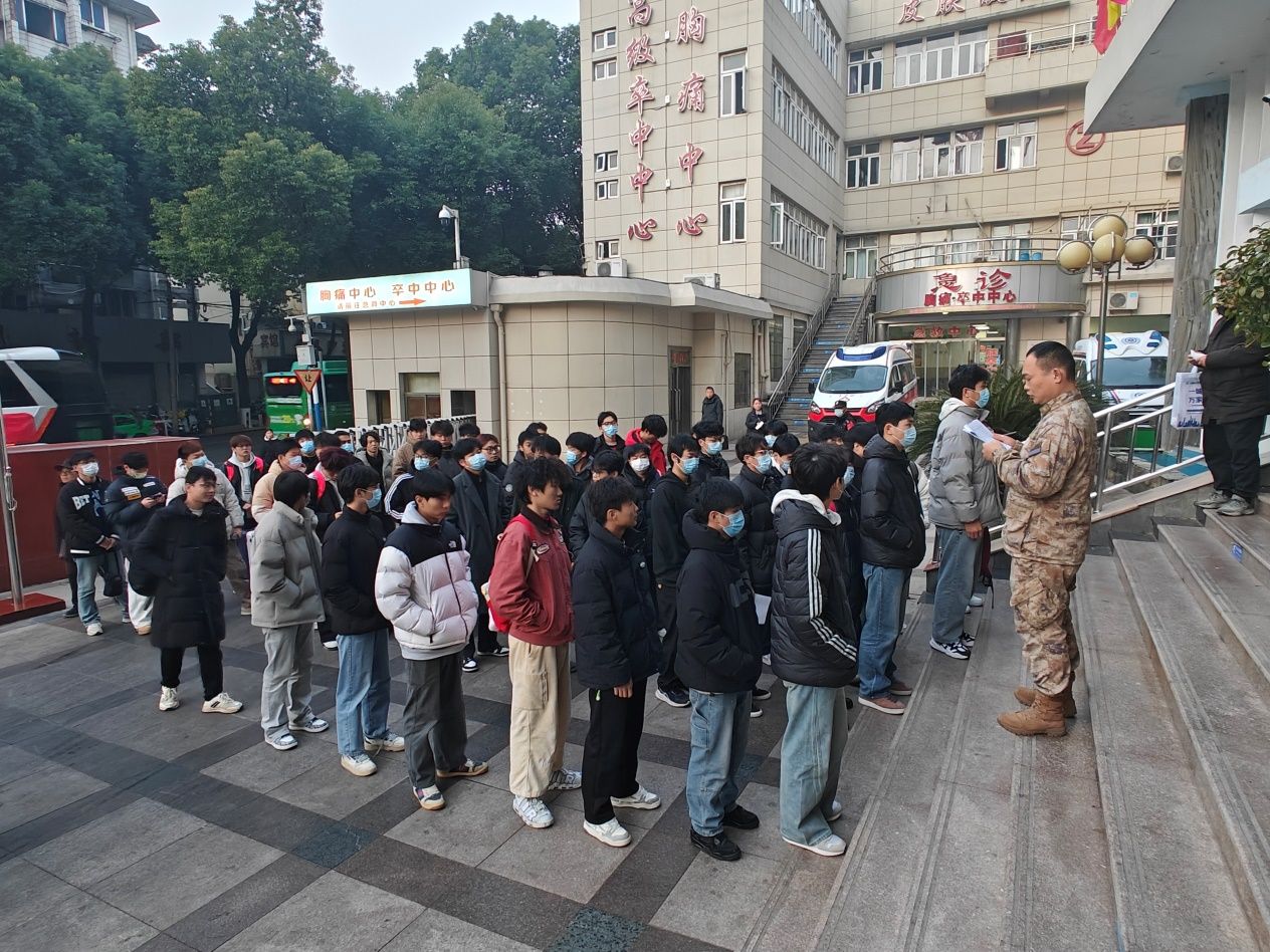 青春风华正茂,参军无上光荣。为积极响应国防应征入伍工作,根据安庆市宜秀区及学校征兵办相关工作安排,1月6日清晨,通过学校初审初检的80余名学生,怀揣着对国防事业的崇高敬意与满腔热血,在学校征兵工作站老师的带领下,前往安庆市第一人民医院进行2025年春季征兵上站体检工作。