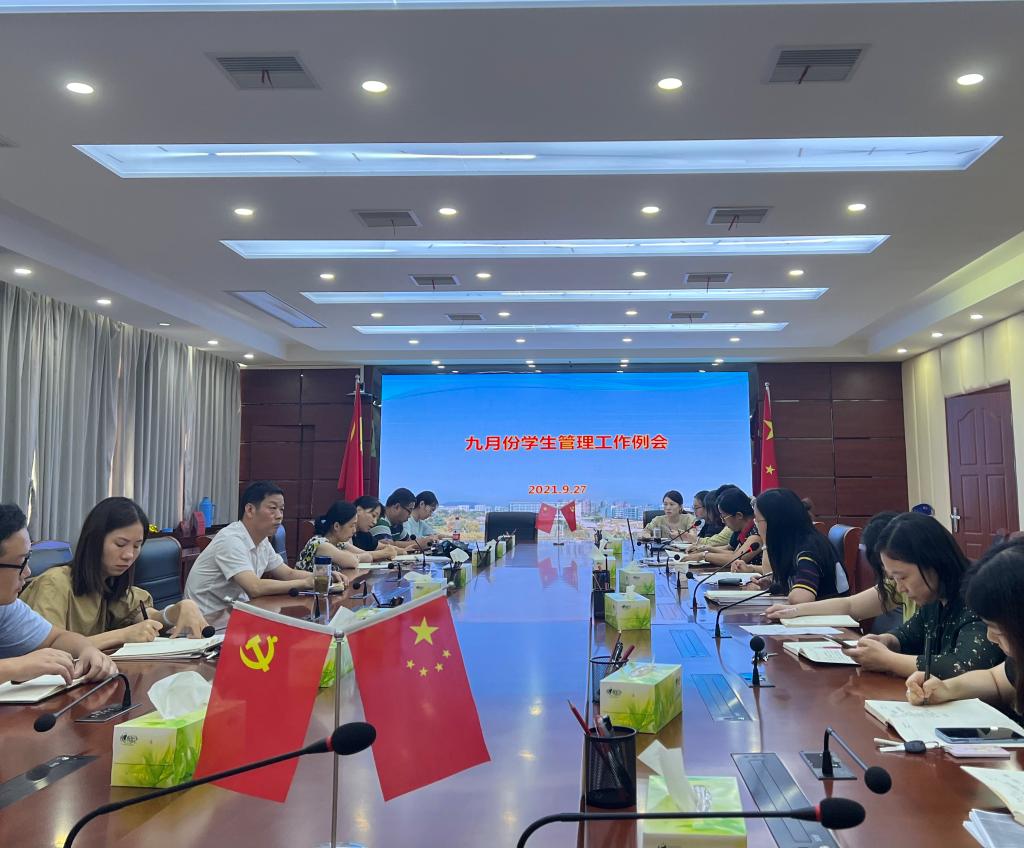 2021年9月27日中午,今年会在行政楼三楼会议室召开学生管理工作月度例会。副校长毛以成出席会议,学生处负责人、各系党总支书记、副书记,学生管理人员以及学生处全体工作人员参加会议。