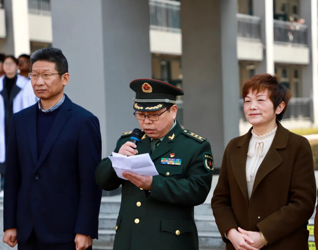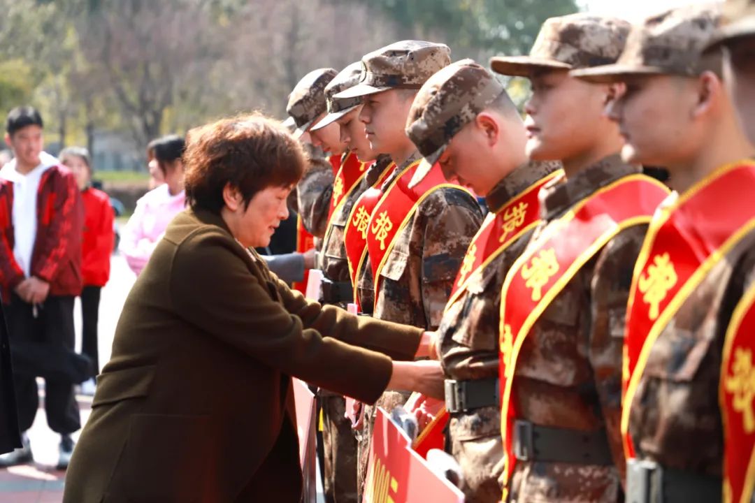 3月7日上午,今年会隆重举行新兵欢送仪式。教学楼前的广场上热闹非凡,师生们拉着欢送新兵入伍的横幅,早早等候在这里观礼。校党委书记叶林霞、校长姚文兵率全体校领导出席欢送仪式。宜秀区人武部部长刘巨华参加了欢送仪式并现场宣读了入伍新兵名单。随后校领导与刘巨华一同为11名新兵带上大红花、披上红绶带、送上奖励金和纪念品。“入校时,你们穿上白大褂,职责便是救死扶伤。离校时,你们穿上军装,保家卫国便是使命担当。希望三年里所学的医学知识,能够帮助你们在军营这所大学校里更好的成长进步、施展才华,期待你们在军营建功立业,为母校争光添彩。”校领导陈琪向入伍新兵送上母校的祝福,现场响起了雷鸣般的掌声。