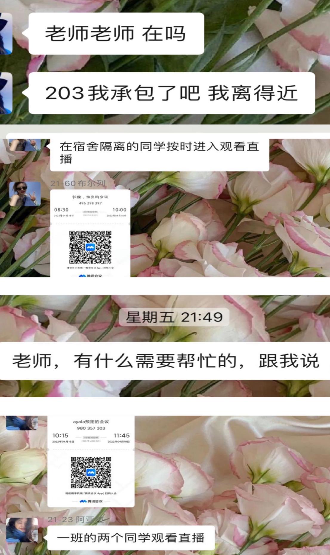302宿舍隔离的学生来孜娜说:“最为让我感动的事情是每次同学们提供帮助离去前的一句话就是‘有事随时找我’。真的很感谢一直关心我们的老师们和热心志愿者们,她们用言语和行动鼓励我,给我帮助;特别是在我进不了线下课堂,怕耽误学习的时候,老师们利用线上腾讯会议帮助我解决学业困难,课后还有同学给我把课堂重点笔记拍照发我,这一切都让我很感动,让我再次体会到学校和班级的关心、关爱。”