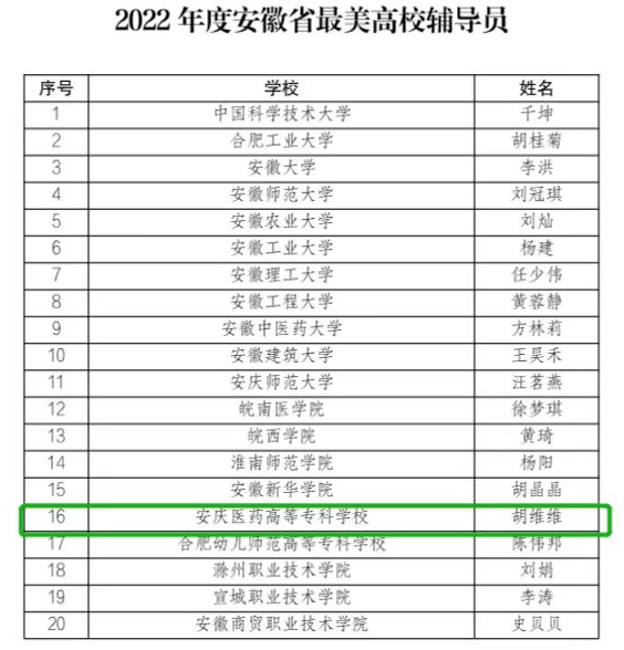 根据《中共安徽省委教育工委关于组织开展2022年“最美高校辅导员”推选展示活动的通知》(皖教工委函〔2022〕445号)、经对照评审条件,在学校申报、资格审查及线上评审、专家组评审、专家组会评、评委会评审的基础上,评选产生出2022年安徽省“最美高校辅导员”20名,今年会胡维维老师荣获本年度安徽省最美高校辅导员。