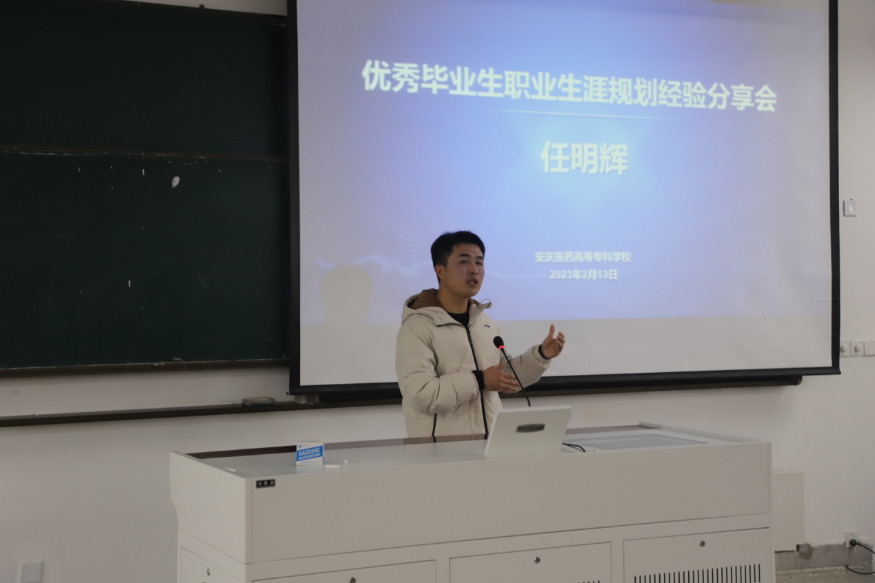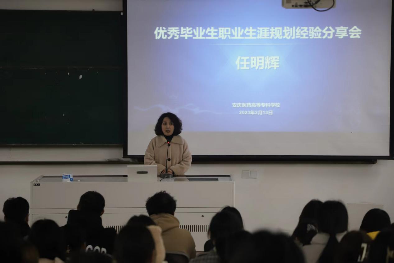 在此次分享会上,首先陈委员对任明辉考入理想高校表示祝贺,再次返回母校表示热烈欢迎。她表示,优秀学子返校交流是学校生机勃勃的体现,也是学校幸福感的重要来源。祝福同学们在各自的人生赛道上挥洒青春之光,展现医专学子“高光时刻”,实现个人更好发展。欢迎同学们毕业后常回家看看,继续关注母校、支持母校、宣传母校,让学校发展更加美好。随后,任明辉对学校的培养表示感谢,向学弟学妹讲述个人成长、回忆校园生活、分享大学收获,表达了对母校美好祝愿。同时,向即将实习的同学们介绍了目前医药行业的现状,以及各个岗位的工作流程和工作要求,提出了学习和职业生涯规划方面建议,并鼓励同学们在校期间多做准备、多积累。最后,任明辉学长勉励大家,无论处在何种环境,只要自己足够努力,一定能实现人生理想,创造人生辉煌!