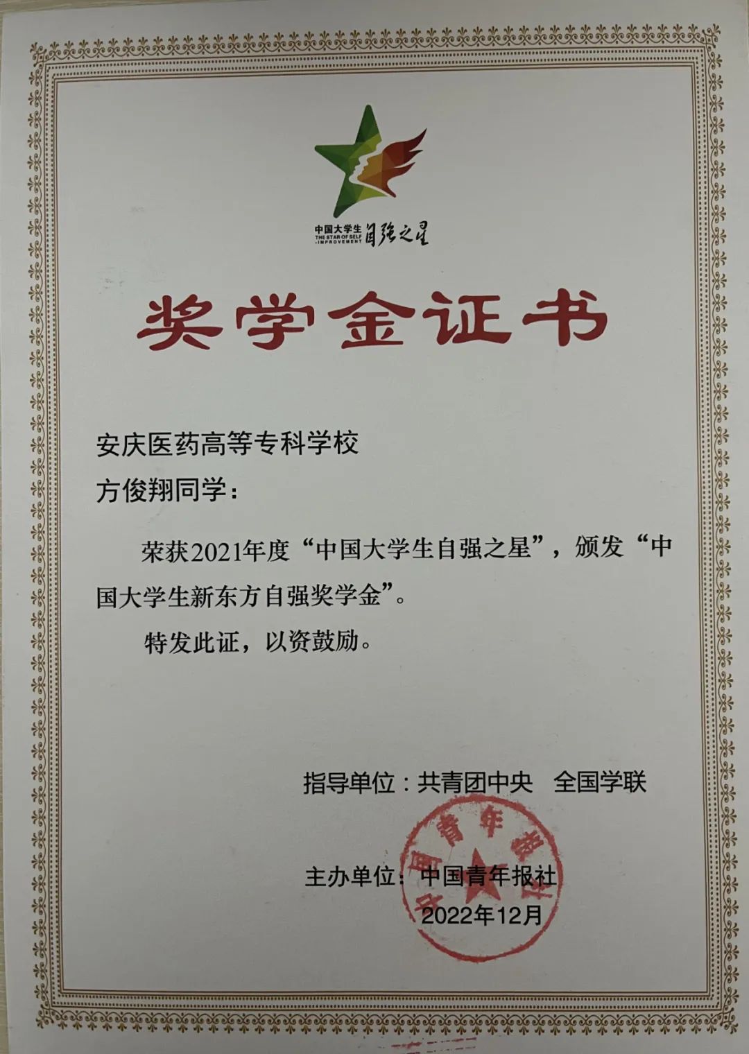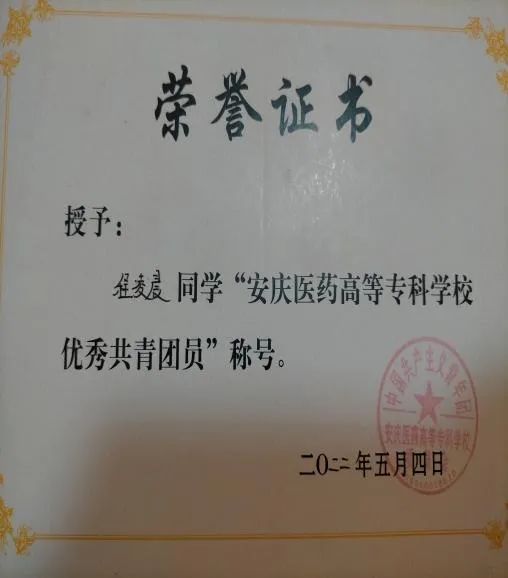 在学院2022年度“五四”评优中获“优秀共青团员”和“优秀志愿者”的荣誉称号,始终坚持自强不息,立志成才的信念,保持着昂扬的斗志和坚韧不拔的作风,坚定不移地朝着既定的奋斗目标前进。