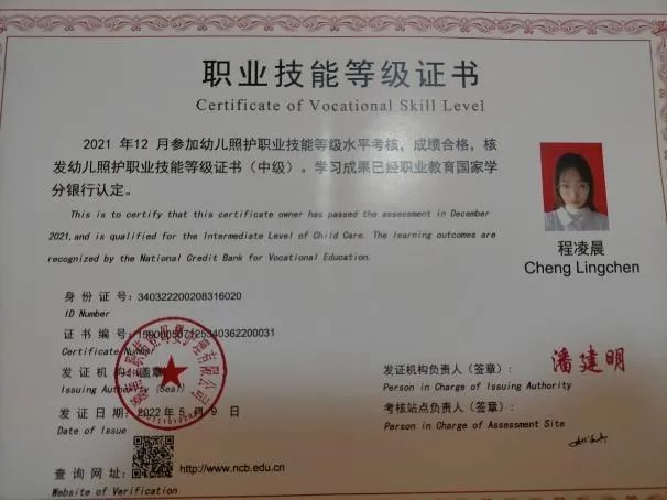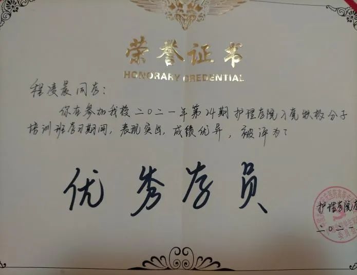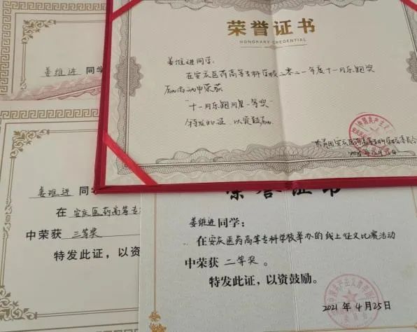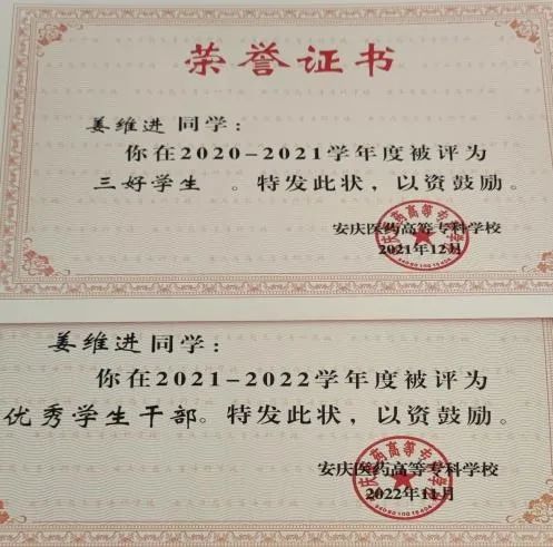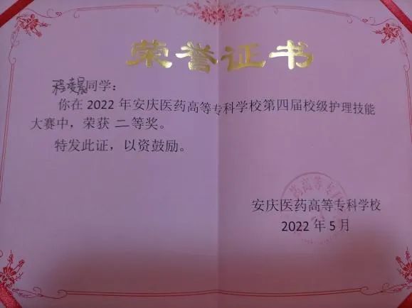 担任学习委员期间一直保持良好的学习作风,坚持对护理专业的热爱,提高专业理论的同时,注重操作与理论相结合,在2021-2022学年综合测评取得班级第一的成绩,获得国家励志奖学金,被评为”优秀学生干部”。在校期间积极参加各项集体活动,获得校国家安全征文三等奖、校八段锦三等奖、校环保节约答题二等奖、vlog视频拍摄三等奖,并且积极考取各项专业证书,获得幼儿照护1+x职业证书、英语四级证书。