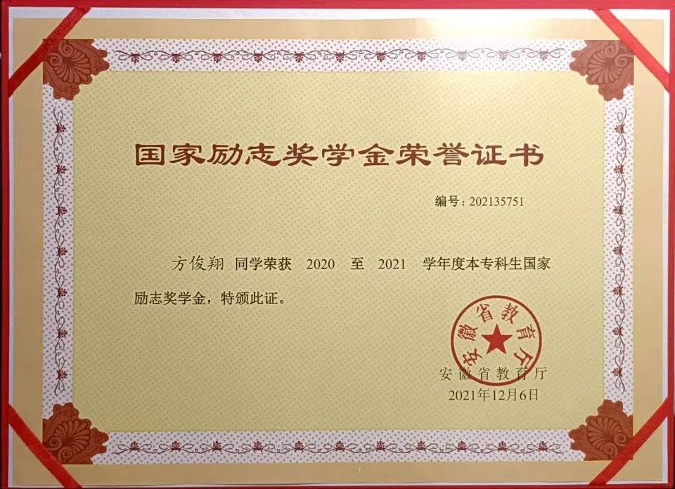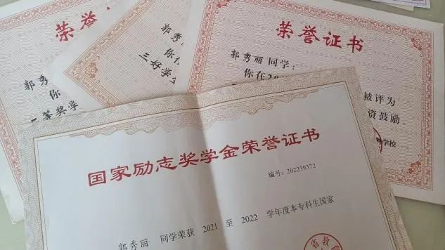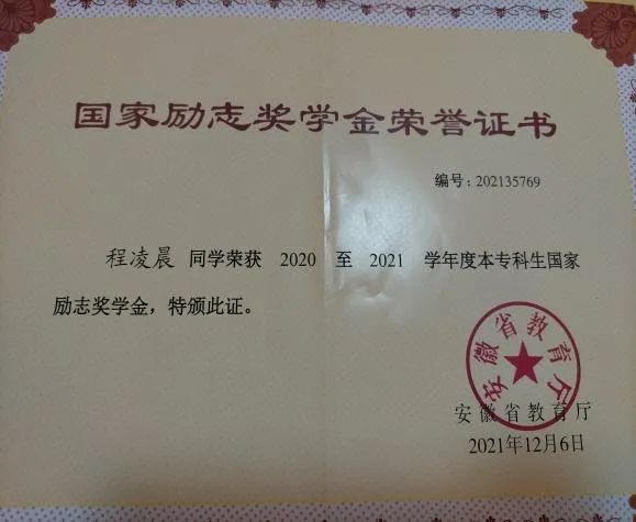 她勤奋好学、态度端正、目标明确,基本上牢固的掌握了一些专业知识和技能,做到了理论与实际相结合;除此之外,还注意各方面知识的扩展,提升其他学科的知识,提高自身的思想文化素养。在2020、2021连续两年被评为三好学生,获得了校级奖学金和国家励志奖学金。