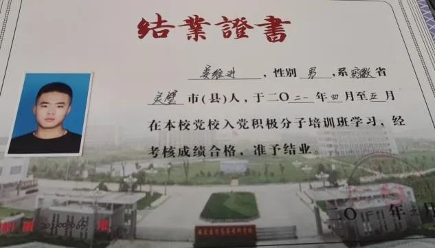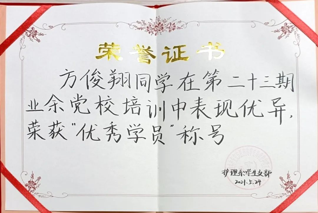 红色基因是流淌在军人血脉当中的精神营养,是渗透在八一军旗上的鲜红印记,是人民军队无往而不胜的不竭动力源泉,是革命理想高于天的坚强信念,作为一名退伍复学的学生干部,他在部队的两年里,受到红色历史的熏陶,在政治思想方面,具有坚定正确的政治方向,在思想和行动上严格要求自己,在不断加强自身素养的同时,做好各项工作,全心全意为同学服务。在校期间积极向党组织靠拢,2021年4月至5月参加护理学院第二十三期业余党校培训班学习考核合格,顺利结业,并获得“优秀学员”的称号和顺利通过答辩;2022年6月13日成为一名中共预备党员;2022年6月参加了安徽省青年马克思主义培训班学习并顺利结业,在学问思辩中更加坚定了理想信念。