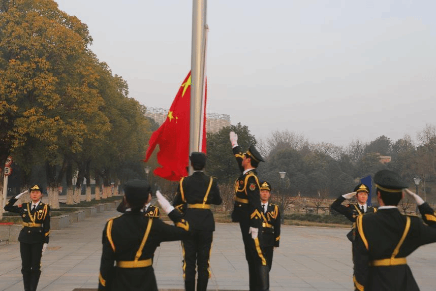 仪式在嘹亮的国歌声中拉开帷幕。校国旗护卫队迈着坚定有力的步伐护送国旗至升旗台,擎旗手迎风振臂,熟练有力地将国旗向空中展开,五星红旗冉冉升起,迎风飘扬。全体学生向国旗行注目礼,齐唱国歌,心潮澎湃。