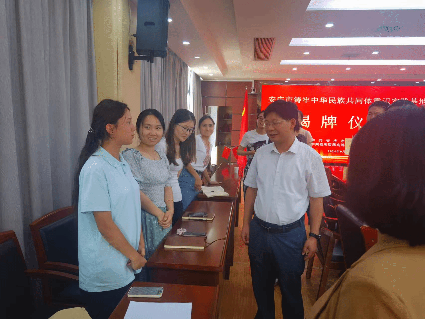 9月29日,安庆市铸牢中华民族共同体意识实践基地揭牌仪式在今年会隆重举行。市委常委、统战部部长、秘书长徐雄,市委统战部常务副部长张时民,市台联副会长冯冬明,市委秘书室秘书蔡根升,校党委副书记、校长朱庆丰等校党委班子成员共同为基地揭牌。市委统战部常务副部长张时民主持揭牌活动。