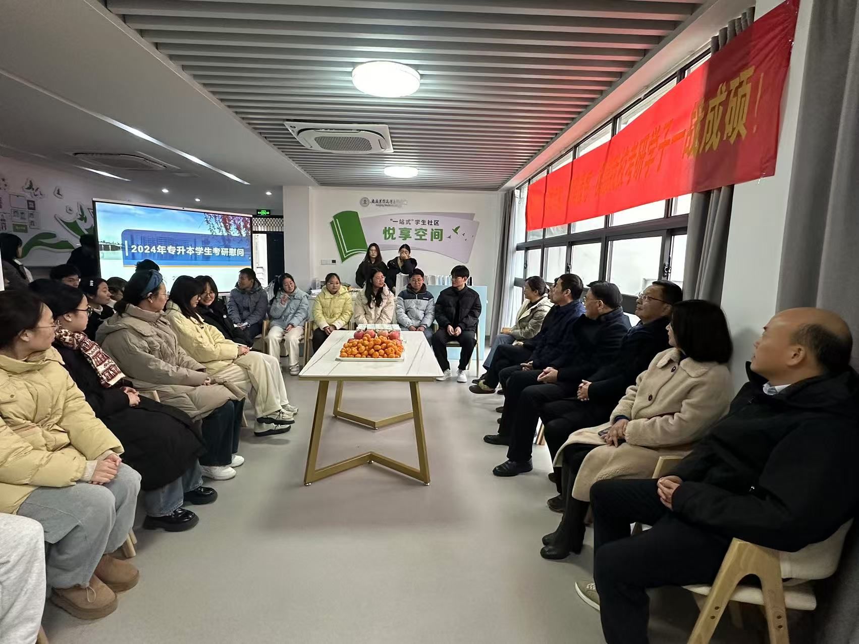 为深入了解专升本班级学生备考情况,帮助考研学生缓解压力,坚定考研信心,积极冲刺迎考,12月10日中午,校领导朱庆丰、张仕庆、毛以成、陈琪、刘毅、曹怀,教务处、学生处主要负责人及各学院党总支书记、副书记、学管工作人员一行,来到“悦享空间”一站式学生社区开展考研慰问活动。