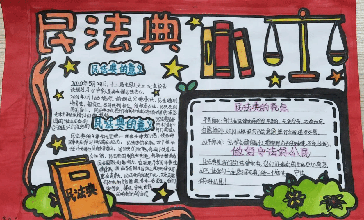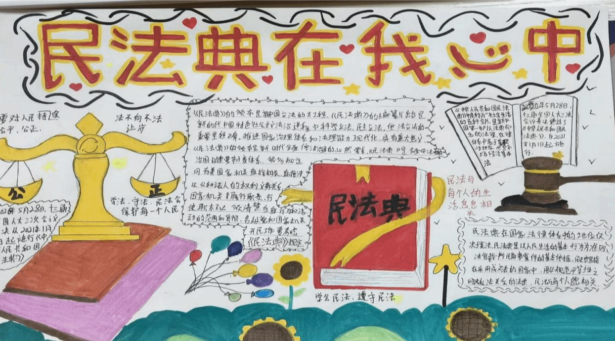 在本次民法典宣传月期间,中职班同学们以手抄报为载体开展“美好生活·法典相伴”系列民法典宣传,活动现场学生们精心设计,以形状凸显法律保护的重要性,采用书本形状来展现知识传播的特性。插图中融入了法槌、天平、法典等法律元素,与文字内容相得益彰,共同营造出浓郁的法治宣传氛围。