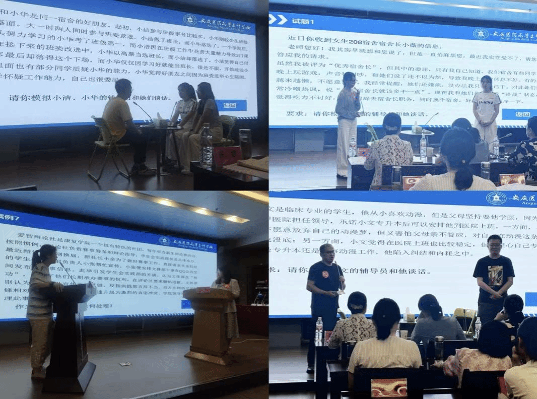 决赛设有辅导员素质能力大赛谈心谈话和案例研讨两大环节。谈心谈话环节采用现场谈话的方式,现场展示包括宿舍矛盾、家庭变故、学业抉择、助学金认定、违反校规、不当言论等大学生生活及学习中的常见问题,通过模拟谈心场景,考察辅导员对相关理论政策、学生特征、学生成长成才规律的了解,以及对学生的教育引导能力;在案例研讨环节,参赛选手采用AB角签位“我提问,你回答”的方式,围绕案例核心问题、解决思路及办法依次阐述。案例涵盖学生学业失衡、教育活动配合度差、班委罢免争议、学生境外被骗、实习受挫、转专业融入难等常见场景。选手结合案例内容深入研讨,提出应对措施、分享见解,在限时研讨中交流提升,重点考查辅导员运用理论分析、解决及应急处理问题的能力。