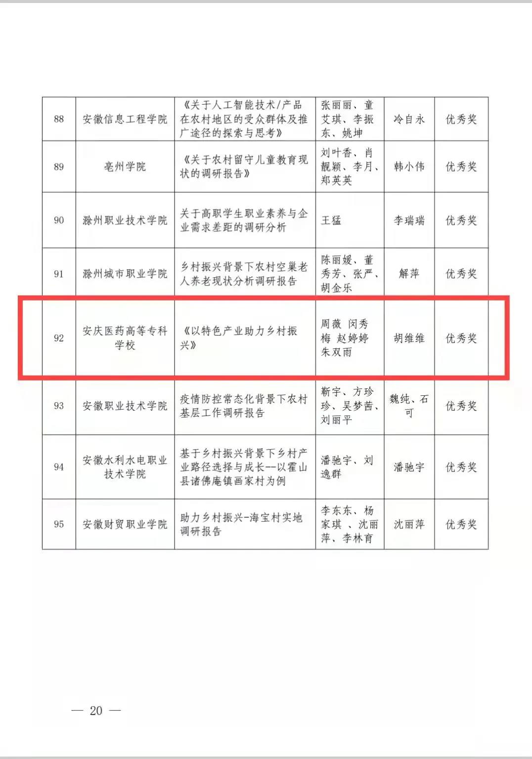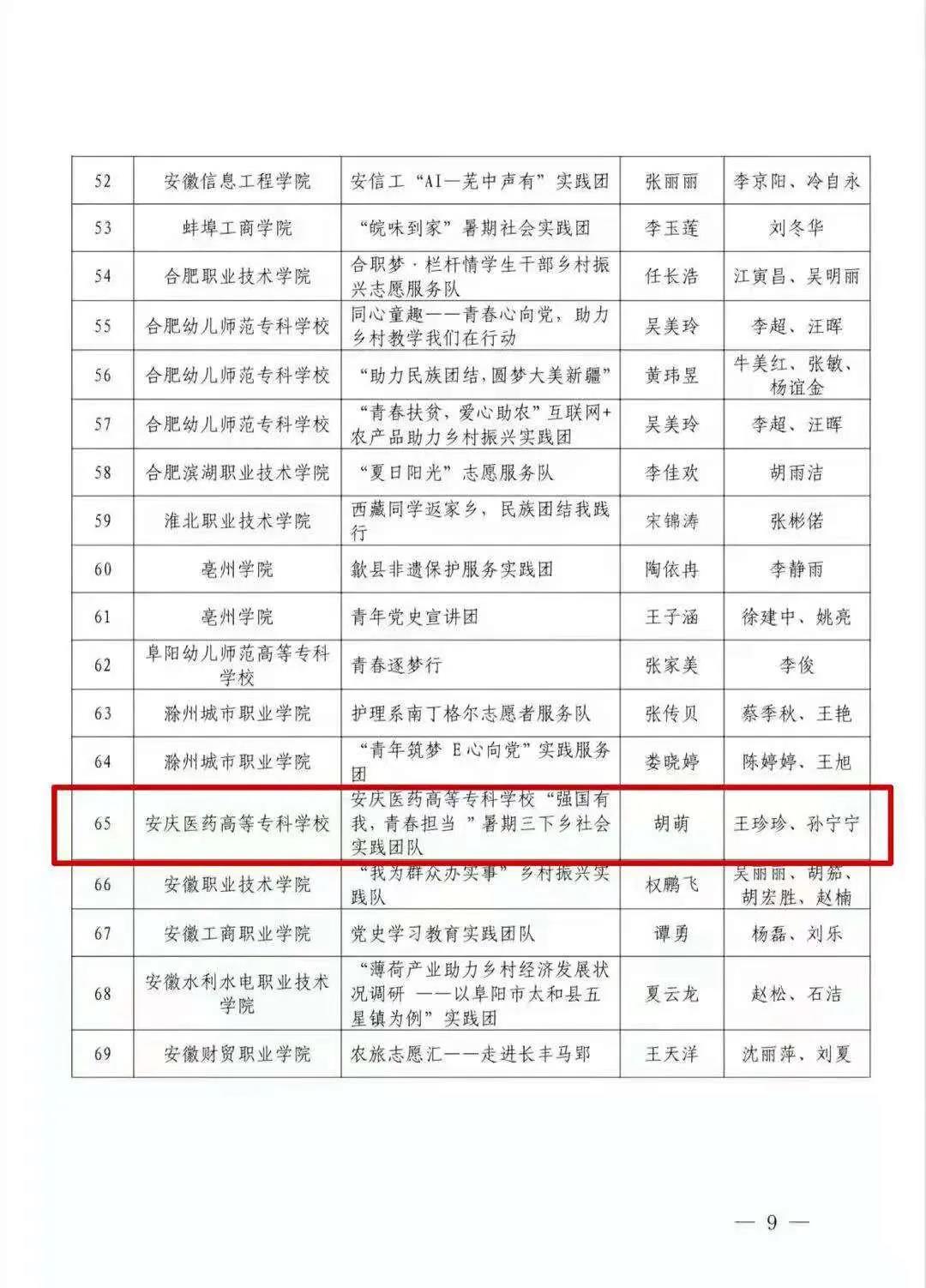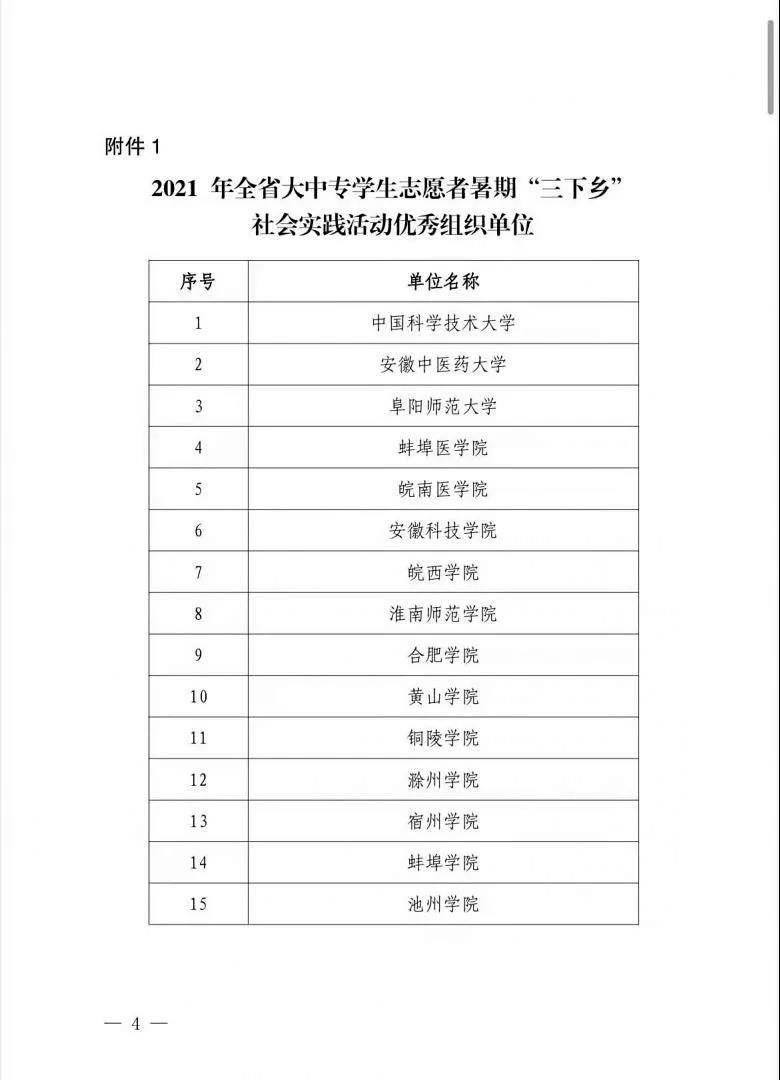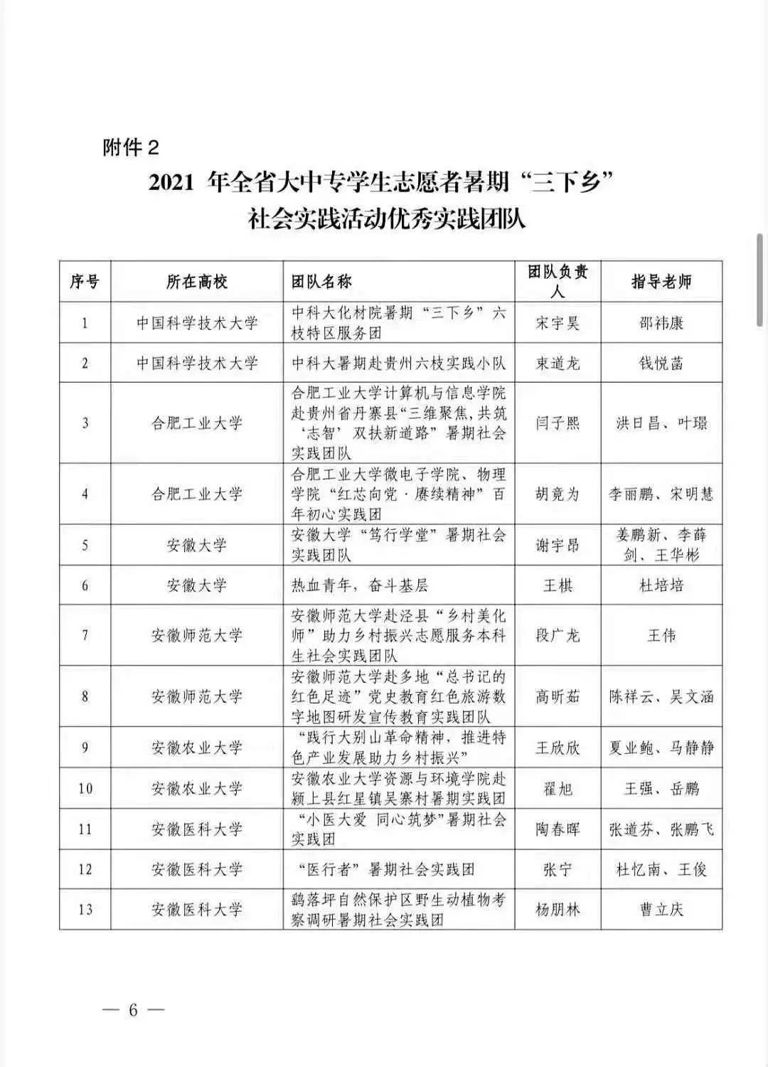 近日,省委宣传部、省文明办、省教育厅、团省委和省学联联合印发了《关于公布2021年安徽省大中专学生志愿者暑期 “三下乡”社会实践活动评选结果的通报》,对表现突出的先进集体和个人进行表彰。今年会被评为“优秀组织单位”,1个团队被评为“优秀实践团队”,2人被评为“优秀个人”,1个项目获得社会实践优秀调研报告“优秀奖”。