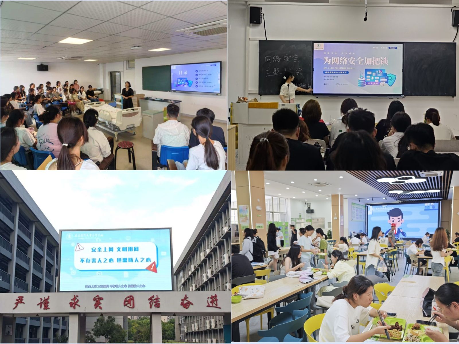 活动期间,学校采取线上线下联动的方式,积极营造网络安全宣传氛围。通过张贴海报、发放手册、在食堂及教学楼电子屏循环播放网络安全宣传视频等形式,切实提高师生网络安全意识,增强识别和应对网络危险的能力。同时,动员全校师生参与中国大学生在线“守护青春 网络有你”系列活动,组织收看“反诈大讲堂”“开学反诈第一课”等课程和直播,并通过微信公众号、部门网站、班级群和主题班会等平台全面推送活动信息,实现宣传全覆盖、有实效。