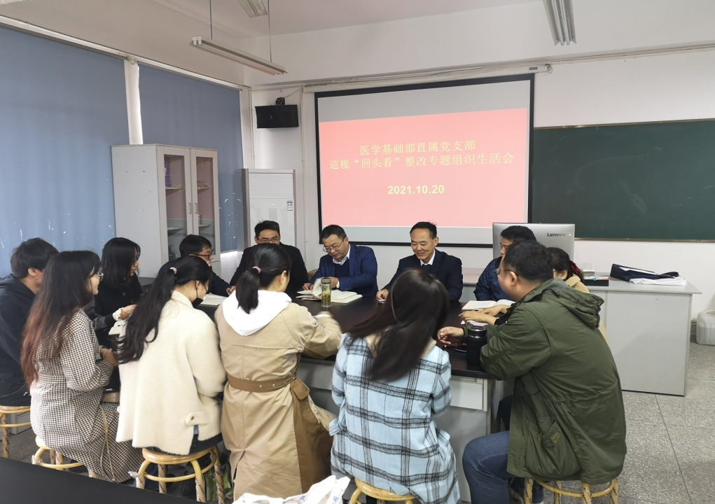 10月20日中午12点30分,医学基础部直属党支部在生化实验室召开了巡视“回头看”整改专题组织生活会,校党委委员朱三九及支部全体党员参加了会议,会议由直属党支部书记贺正皖主持。