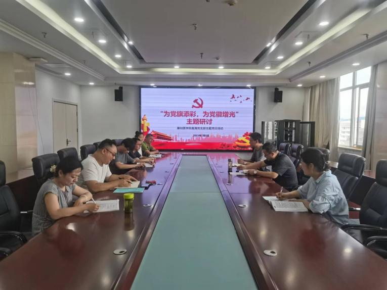 2022年7月5日,基础医学院直属党支部在图书馆六楼会议室进行“为党旗添彩,为党徽增光”主题研讨活动。校党委委员朱三九参会,支部副书记杨小四主持,支部全体党员参加。