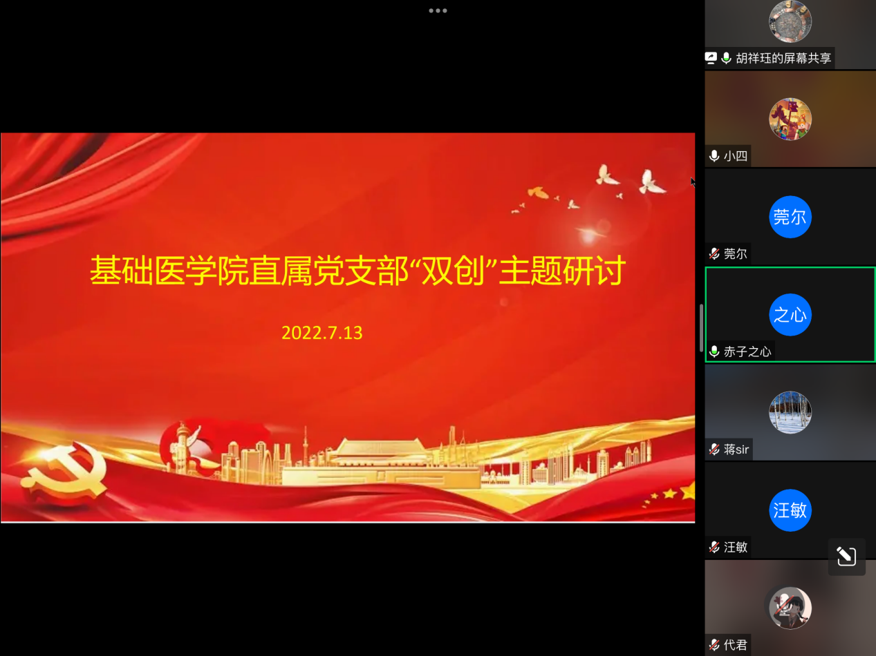 2022年7月13日下午,基础医学院直属党支部通过腾讯会议线上召开“双创”主题研讨会,会议以“双创”工作为主题,讨论支部新时代高校党建示范创建和质量创优工作。会议由支部副书记杨小四主持,全体党员线上参会。