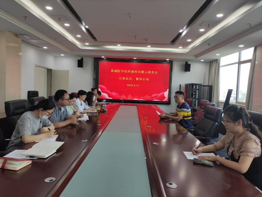 2022年8月31日,基础医学院在图书馆六楼会议室召开师德师风警示教育大会。基础医学部副院长杨小四主持、全体教师参加了此次会议。
