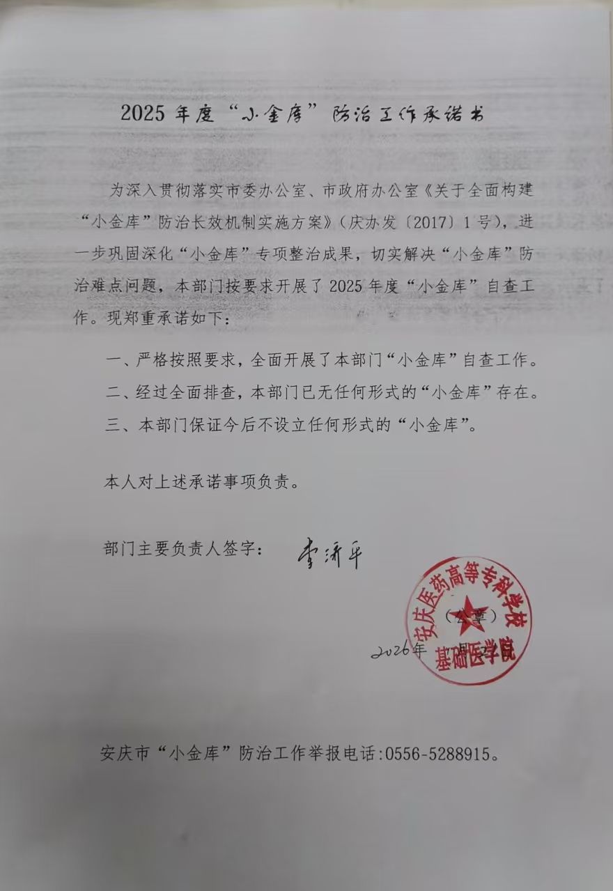 2025年度基础医学院“小金库”防治工作承诺书
