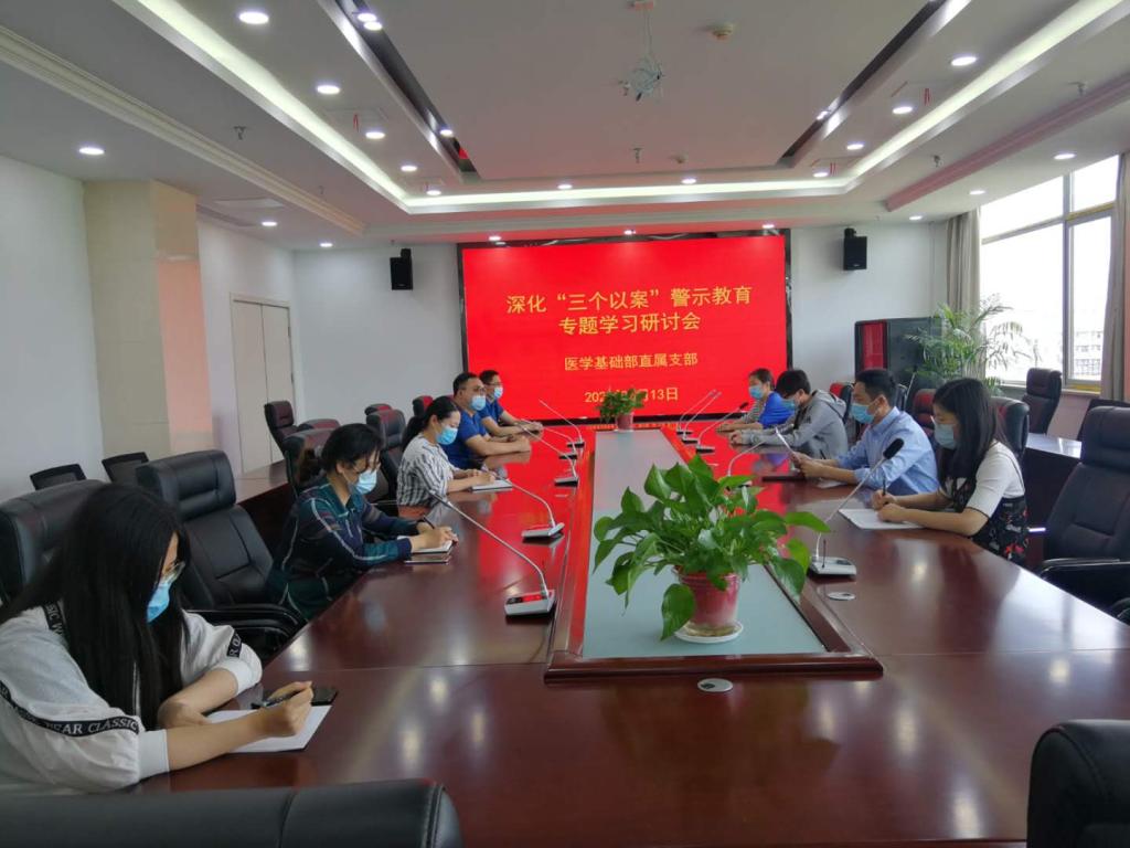 513日,医学基础部直属党支部在图书馆六楼会议室召开深化“三个以案”警示教育专题学习研讨会,医学基础部直属支部全体党员参加会议,刘毅主持会议。
