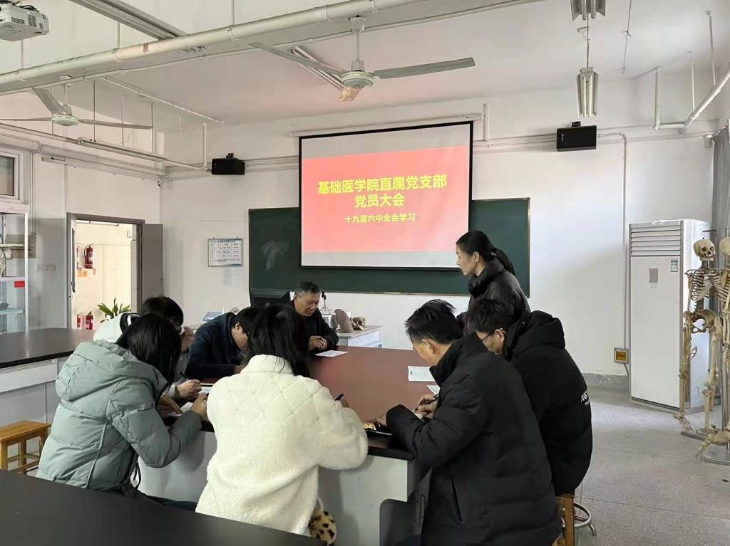 12月20日中午,基础医学院直属党支部在解剖实验室召开全体党员大会,支委带领大家学习中国共产党十九届六中全会精神。
