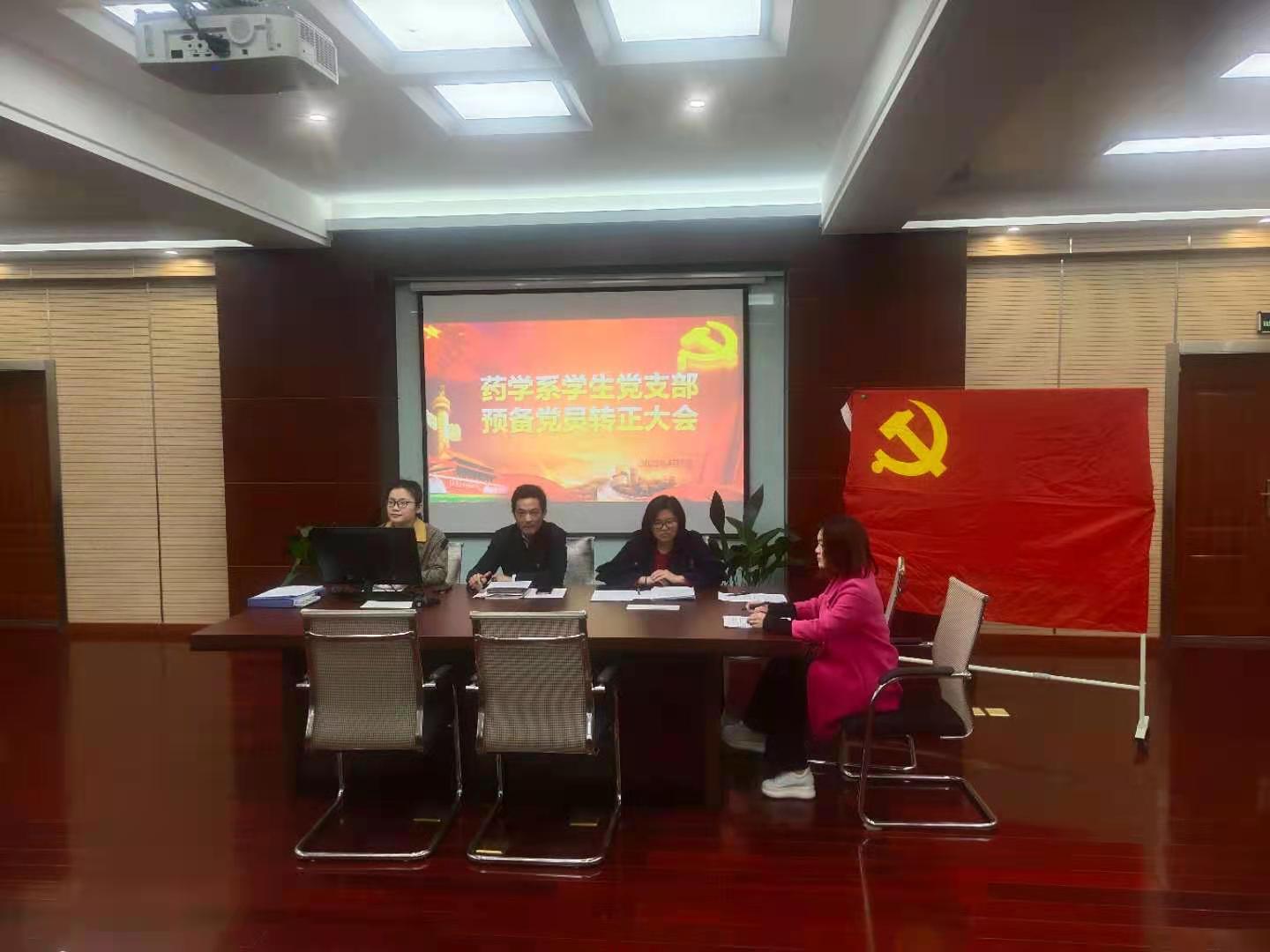 2021年4月7日,药学系学生党支部在药学系实训楼一楼会议室召开预备党员转正会议,会议由学生党支部副书记祝燕平主持,支部全体党员参加会议。