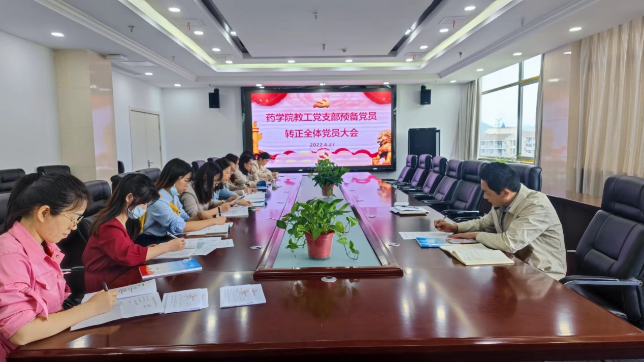 2022年4月27日,药学院教工党支部召开全体党员大会,讨论预备党员慈傲特、陈雪晴两名同志转正事宜,校党委委员、药学院书记刘毅及支部全体党员参会,会议由支部书记任丽英主持。