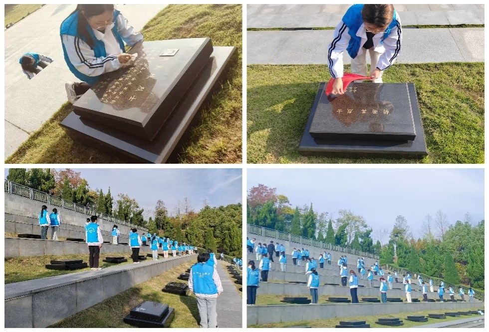 烈士墓前,同学们认真阅读着墓碑上的烈士生平简介,感受着那段峥嵘岁月,轻拭墓碑,在心中种下了传承红色精神的种子,肃立默哀,致敬缅怀先烈。