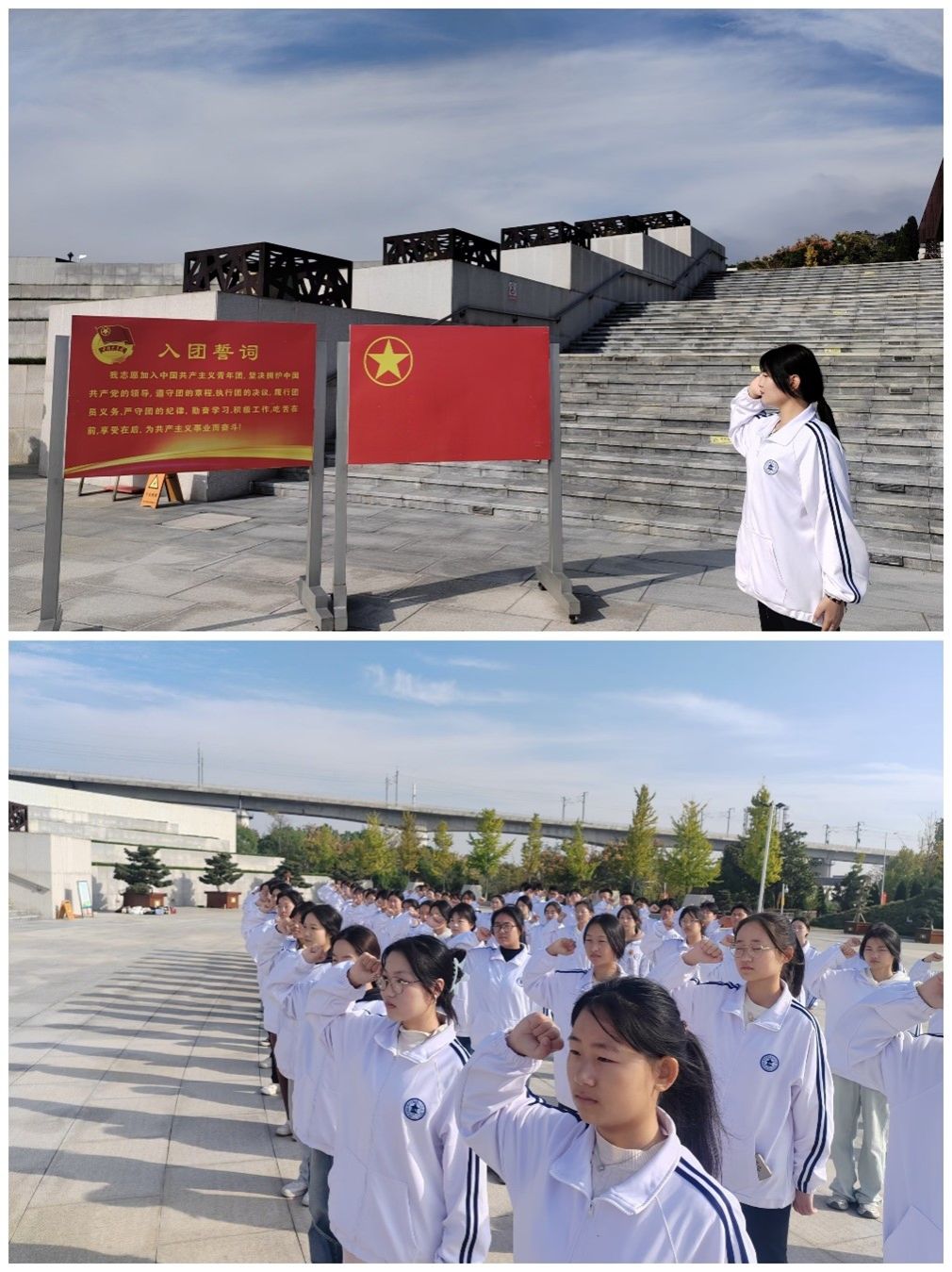 全体同学身着校服,在李健的带领下徒步前往安庆市烈士陵园,路途中班旗飘扬,同学们精神抖擞。在战斗雕像前,支部团员们重温了入团誓词,铿锵有力的宣誓在园区中回荡,涤荡心灵,展现着青春活力。