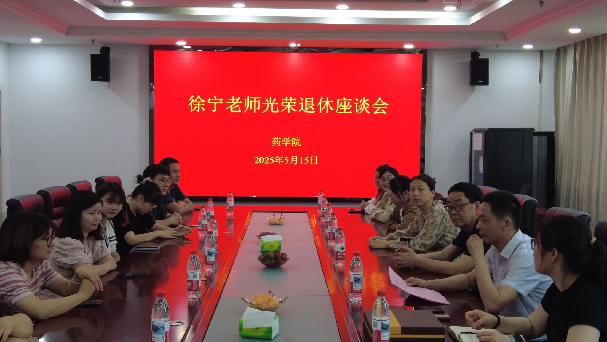 岁月如歌,情怀永驻。2025年5月15日中午在药学院六楼会议室举行徐宁老师光荣退休座谈会。校党委委员、药学院书记、院长刘毅,药学院党政人员,教研室主任及相关教师代表参加,副院长杨莹主持座谈会。