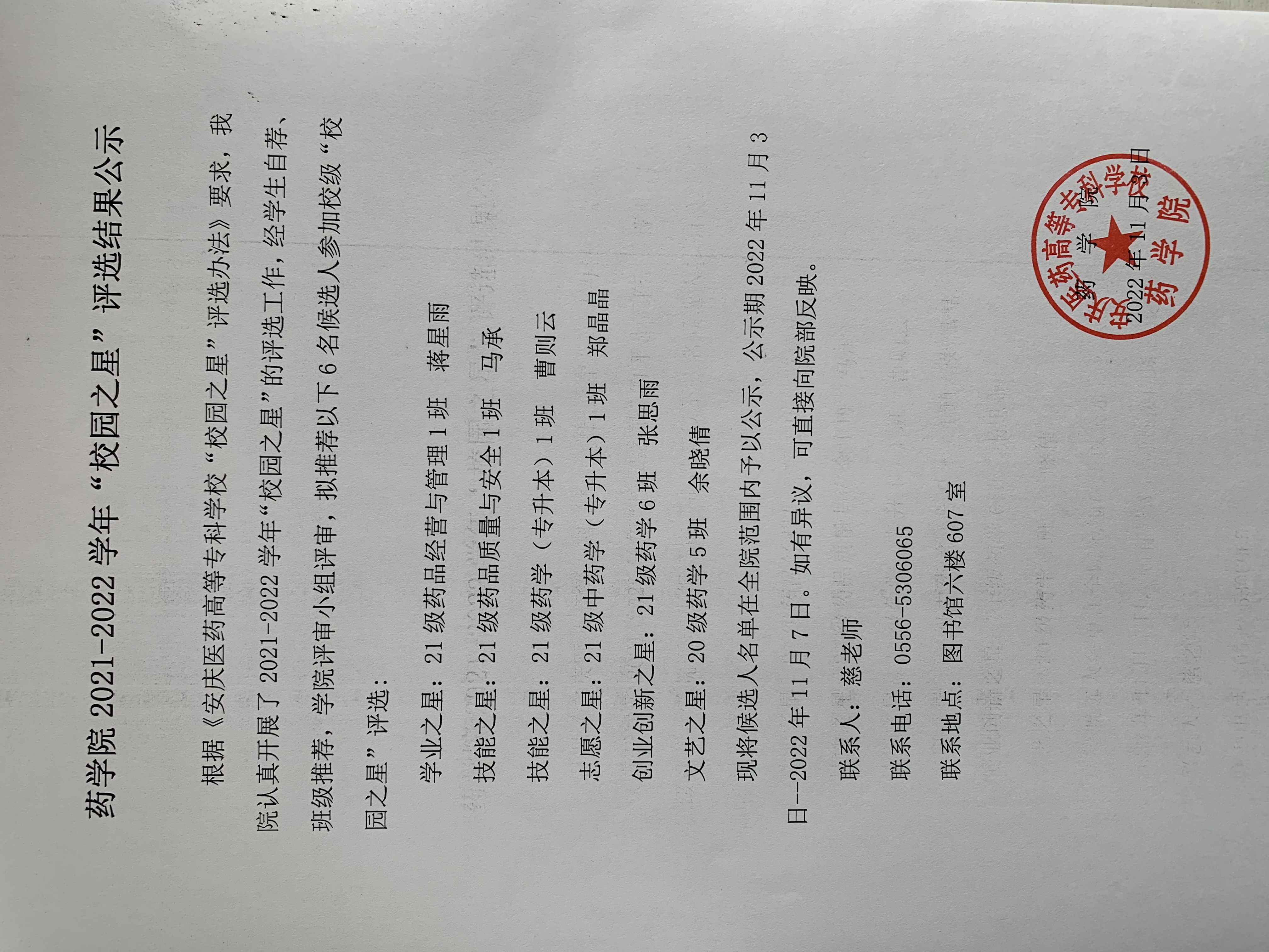 药学院2021-2022学年“校园之星”评选结果公示