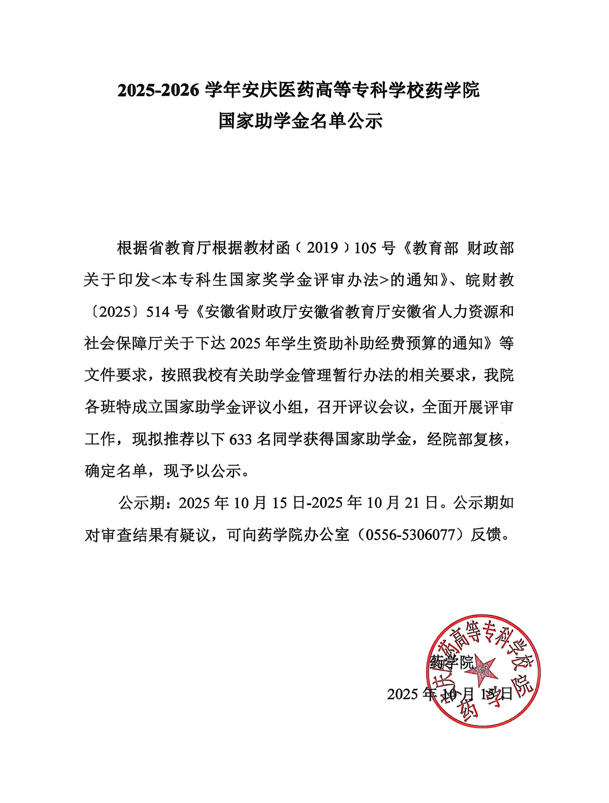 2025-2026学年今年会官网药学院国家助学金名单公示