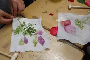 植物拓染活动中,同学们结合《植物学》相关知识,野外采集花草,将自然界所赠予的美进行自身创作并永久保留在布料上,一株草一束花一块布,敲拓到一起,在此过程中去发现美,感受美,创造美。