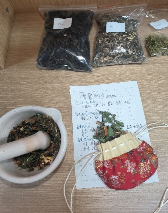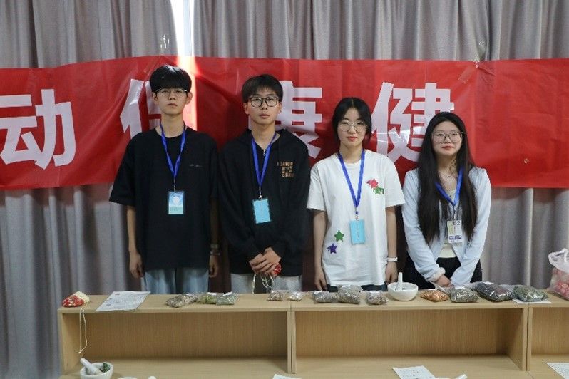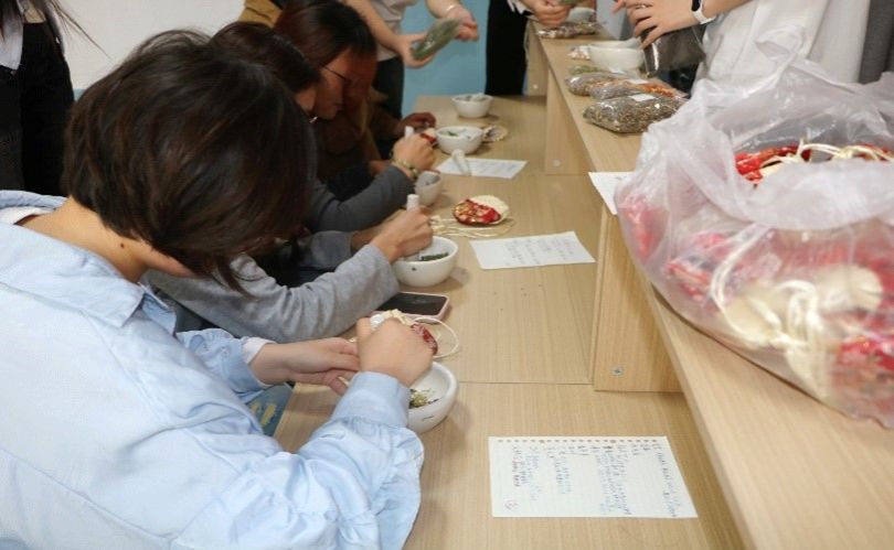 中药香囊DIY活动中,学生会成员分发研钵和钵杵,同学们根据手写的配方配比做出各类不同功效的香囊。大家在挑选、分配、碾磨制作的过程中巩固了中药知识,体会到中药乐趣,深刻感受到中医药文化的魅力。