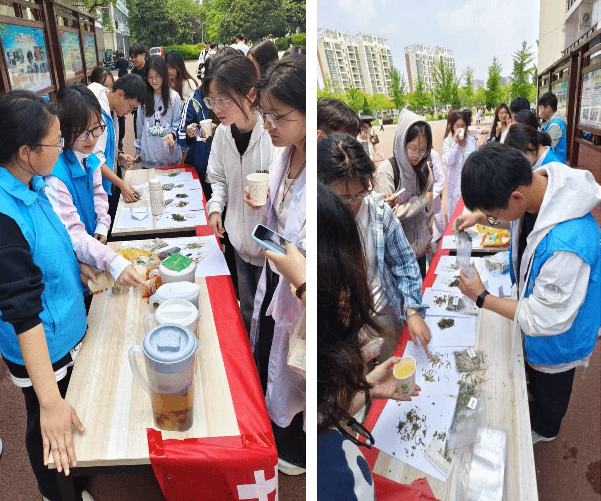 活动伊始,志愿者们在食堂门口搭建起中药展台,陈列了紫苏(解表散寒)、艾叶(温经止血)、薄荷(清热解暑)等十余种中药材,并精心准备了清肝明目茶(如菊花、枸杞)、健脾养胃茶(如山楂、陈皮)等特色中药茶饮。同学们通过品鉴茶饮,感受中医药“治未病”的智慧,让参与者感受中医药的实用性。现场,志愿者还结合药材功效,讲述中医药在抗击疾病、守护健康中的历史贡献,号召青年学子践行五四精神,争做新时代的“健康卫士”。