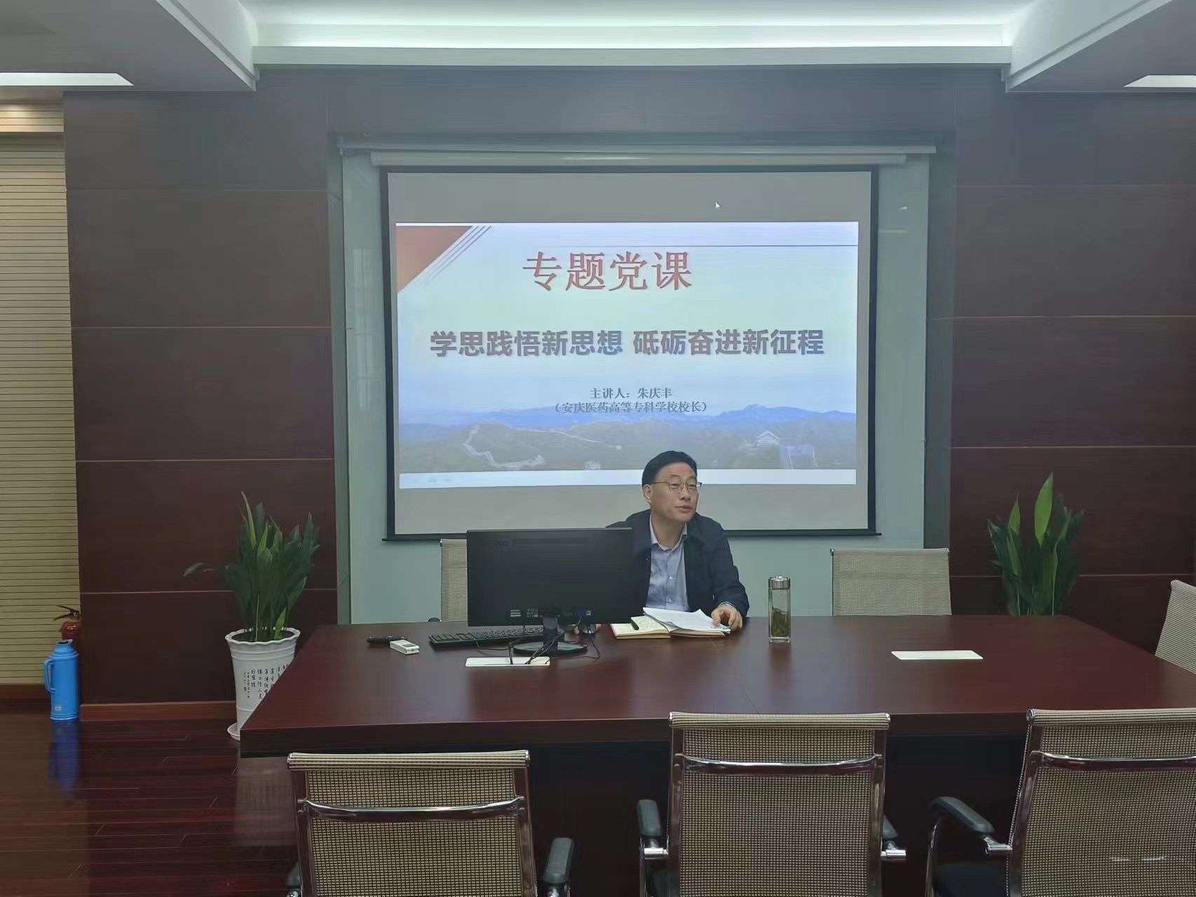 根据学校学习贯彻习近平新时代中国特色社会主义思想主题教育工作安排,为指导学院师生党员准确把握和深刻理解习近平新时代中国特色社会主义思想,切实用党的创新理论统一思想、指导实践、推动工作,11月8日,朱庆丰校长在药学院实训楼一楼会议室,以“学思践悟新思想,砥砺奋进新征程”为主题,为药学院全体师生党员上了一堂生动的党课。