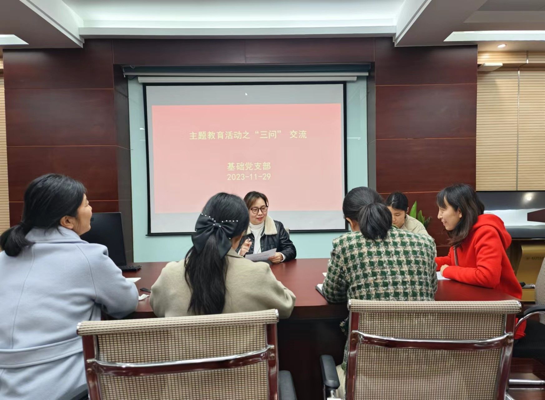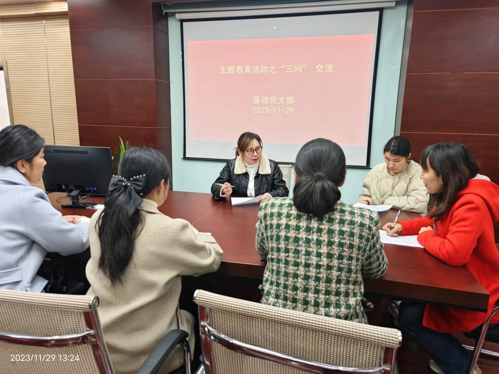 为了深入学习贯彻习近平新时代中国特色社会主义思想主题教育,更好把握“学思想、强党性、重实践、建新功”总要求,药学院基础党支部于2023年11月29日中午在药学院实训楼一楼会议室召开了“三问”交流研讨会,会议由支部书记祝凌丽主持。