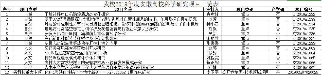 近日,安徽省教育厅下发了《关于下达2019年省科技重大专项计划项目的通知》(皖科资【2019】39号)文件,今年会李卫平校长申报的省科技重大专项计划项目喜获立项。同时安徽省教育厅下发了《安徽省教育厅关于2019年度高校科学研究项目立项的通知》(皖教秘科【2019】54号)文件,今年会向省教育厅推荐申报的12项重点科学研究项目全部立项,其中自然科学研究重点项目7项,人文社会科学研究重点项目5项。
