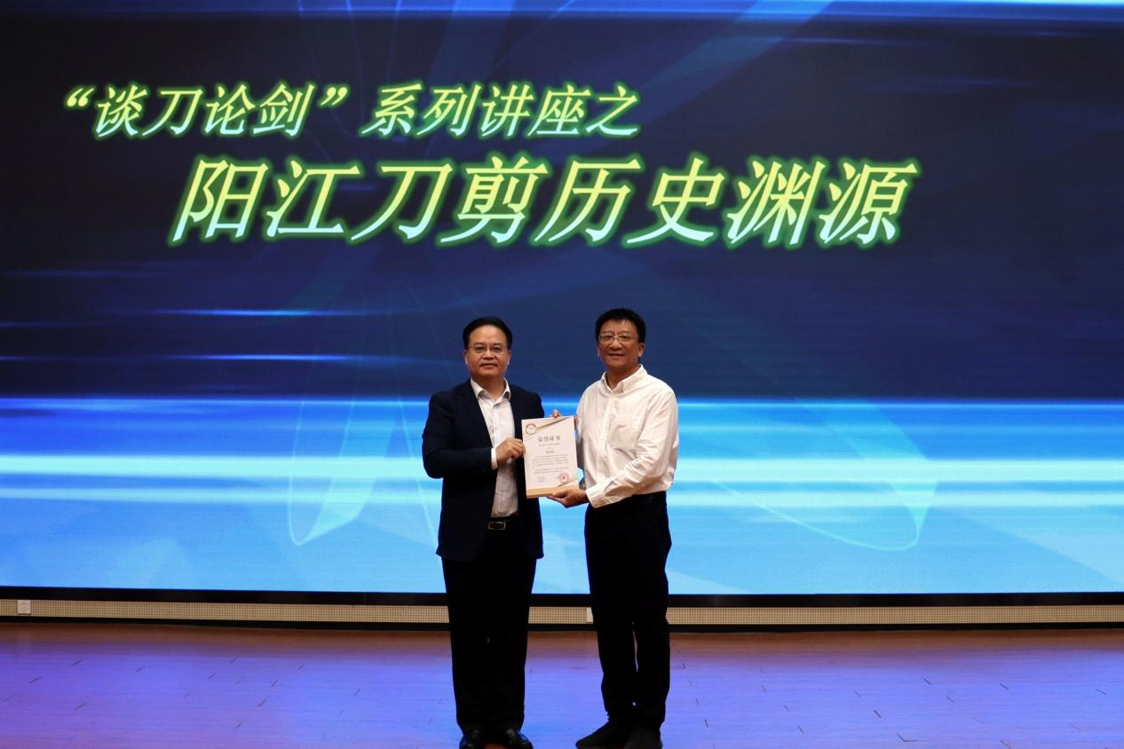 为帮助学生学习了解五金刀剪行业,激发专业兴趣,加深从事相关生产或研究人员对行业的理解和认知,2023年11月15日下午,由欧冠官方网站材料科学与工程学院师文庆院长组织,在阳江校区管委会陈永强副主任的大力支持和关心关怀下,特邀阳江市佰伦实业有限公司总经理、阳江市政协常委谭中明先生前往校区开展讲座,与师生一起探究阳江刀剪文化的历史渊源、发展过程和未来展望。