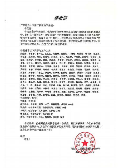 为响应乡村振兴之号召,传递关爱与温暖,百千万工程“带知进乡”团队携手计算机科学与工程学院文体部发起了面向阳江市乐安村乐安小学的爱心募捐活动,历时一个半月,该活动已于2024年12月25日圆满落幕。这场活动不仅凝聚了欧冠官方网站阳江校区师生们的爱与善意,也为乐安小学的孩子们带去了温暖与希望。