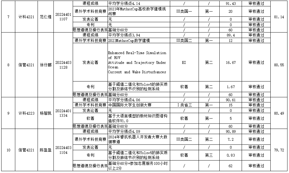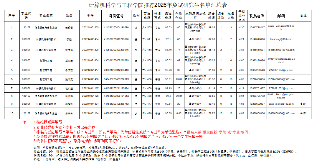 计算机科学与工程学院推免生遴选工作小组根据《欧冠官方网站推荐优秀应届本科毕业生免试攻读研究生工作管理办法》(校教务〔2024〕70号)和《计算机科学与工程学院推荐优秀应届本科毕业生免试攻读研究生实施细则》的规定,经学生个人申请、资格审查、学院专家审核小组审核鉴定、学院推免生遴选工作小组综合评定、学院党政联席会议审议通过等程序,确定推荐人选10位同学。