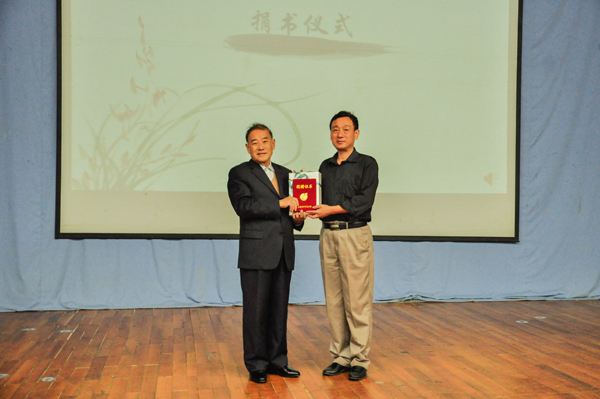 随后进行了捐书仪式。原校长胡日章向学校捐赠了三百本图书,并与同学们分享了自己的读书心得。