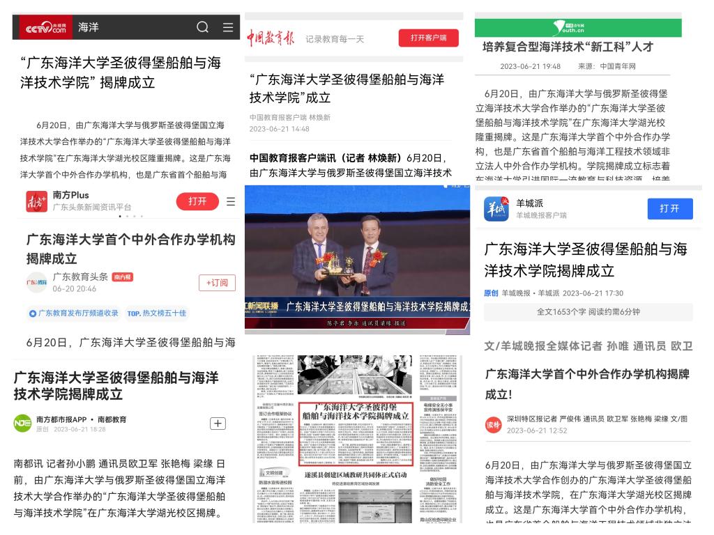 6月20日,欧冠官方网站首个中外合作办学机构——欧冠官方网站圣彼得堡船舶与海洋技术学院在欧冠官方网站湖光校区揭牌。连日来,央视网、中国青年网、中国教育报客户端、中国教育新闻网、南方日报、羊城晚报、南方都市报、深圳特区报、湛江日报、湛江电视台等10余家主流媒体以图文报道或视频等形式聚焦报道了学院揭牌,引发了热烈反响。