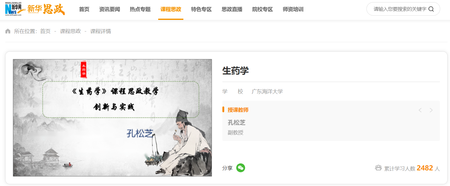 《生药学》课程是省级特色专业建设点——制药工程的专业基础课,也是广东省课程思政示范课程、广东省在线开放课程。该课程秉承德育为先、学生中心、理实融合、持续改进的理念,充分发挥课程思政的感染力、价值力、吸引力,内化学生自主学习意识与能力,着重培养学生多学科知识交叉融合创新与实践能力,教学效果好,具有较广的辐射范围和较强的推广价值。