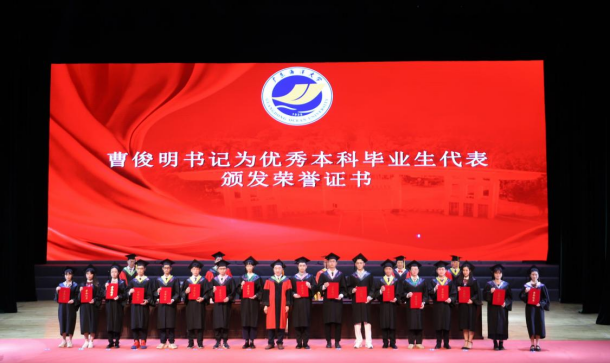 典礼上,学校党委书记曹俊明为2022届优秀毕业生代表颁奖,副校长刘东超宣读2022届优秀毕业生表彰决定,副校长高秀梅宣读2022届研究生学位授予情况,副校长宁凌宣读2022届本科生毕业情况和获得学士学位者名单。副校长刘东超、邓逢光,校党委常委、组织部长林宇分别为考研先进个人代表、创新创业代表、西部山区志愿者代表和优秀志愿者代表颁发荣誉证书。